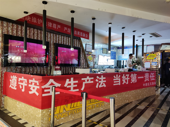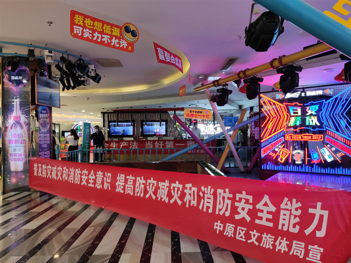 活动当天下午,我局工作人员走进锦艺商场、中原万达内的KTV、电子游艺等文化娱乐场所,通过现场摆放展板、悬挂条幅、发放宣传资料、在场所门头电子屏幕滚动播放《生命重于泰山》、《河南省安全生产警示教育片》等方式积极向群众宣传安全法律法规,普及安全生产知识、文化娱乐场所突发事件应急措施等。并在现场对市民关注的文化娱乐场所突发事件应急处置等问题进行耐心解答,引导群众树立安全意识。