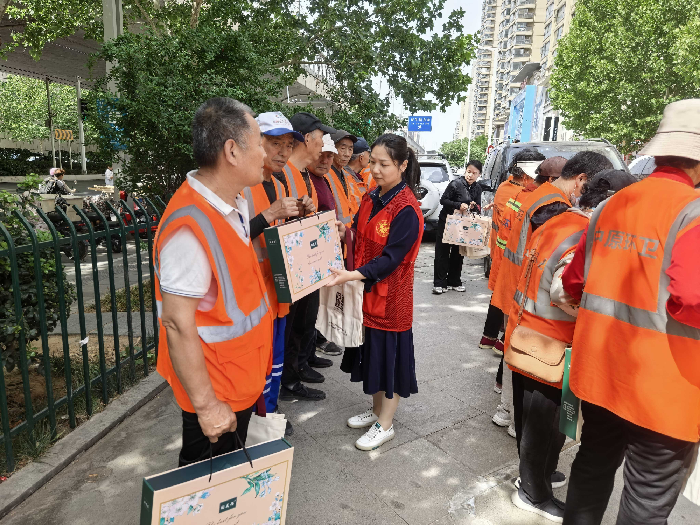 活动现场,中原区图书馆的工作人员满怀热忱,来到航海西路办事处,慰问区城管局一线环卫工人。他们精心准备了图书馆文创产品帆布袋、健康养生书籍,全年活动宣传手册等清凉夏日慰问品,亲手交到环卫工人手中,并送上亲切的问候。一句句“你们辛苦了”“感谢你们的付出”,如同春日暖阳,温暖着每一位环卫工人的心。爱心人员深知,正是这些环卫工人日复一日、年复一年的辛勤付出,才换来了城市的整洁与美丽,他们用汗水诠释着“宁愿一人脏,换来万家洁”的环卫精神,是城市当之无愧的守护者。
