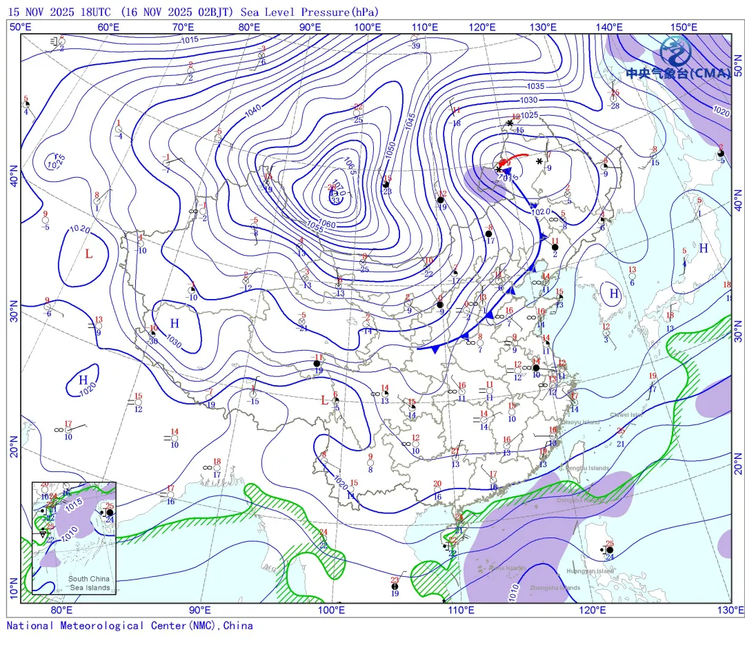 受寒潮影响,预计,11月16日至18日,我国中东部地区将自北向南出现大风降温天气,日平均或最低气温普遍下降6~10℃,陕西南部、重庆北部、河南西部和南部、湖北西部和北部等地下降12~14℃,局地降温可超过16℃。18日前后,最低温度0℃线将南压到苏皖南部至湖北中部一带。